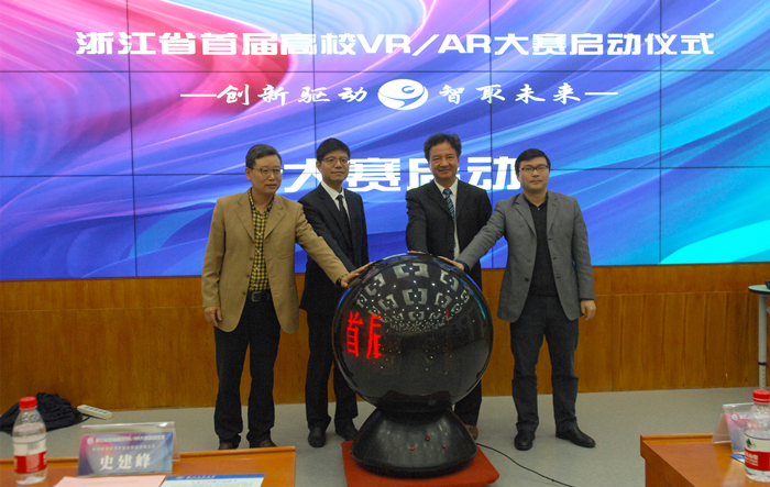 陈寿灿校长宣布“浙江省首届高校VR/AR大赛”正式启动,并与史建峰副主任、厉小军处长、王华书记一同点亮水晶球,开启报名通道。