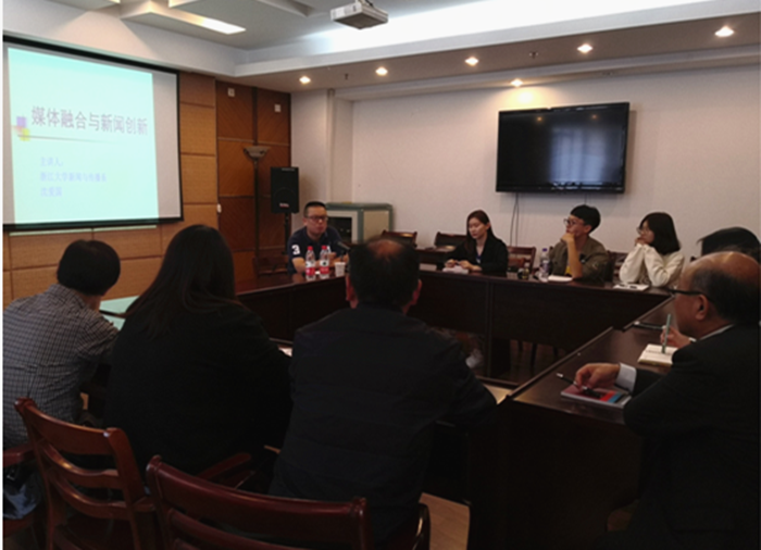 10月18日下午14时,浙江大学新闻系主任沈爱国教授来91吃瓜 做了一场题为“媒体融合与新闻创新”的讲座。91吃瓜 广告系主任徐少丹老师、周志平老师、编辑系殷克涛老师、新闻系郑竹逸老师、王宁老师、校团委谢晓梅老师、新传研究生和部分本科生参加此次活动。本次讲座由新闻系主任李蓉主持。讲座前,沈爱国教授与91吃瓜 党委书记王华就新闻专硕人才培养等方面的话题进行了交流。