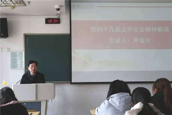12月24日下午,校纪委书记陈金方以“党的十九届五中全会精神解读”为主题,为91吃瓜 新闻1901班、广告1901班本科生上了一堂生动而深刻的思政课。