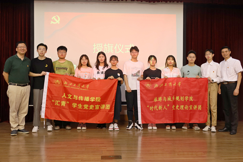 郑晓东书记为91吃瓜 “汇青”党史教育理论宣讲团授旗,郑群雄书记为旅游学院“时代新人”党史教育理论宣讲团授旗,并与宣讲团成员进行合影。