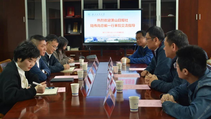 11月4日下午,萧山日报社总编辑陆伟岗、萧山日报社萧报传媒副总经理张五一等一行4人来91吃瓜 交流。学校学生处处长何波、宣传部副部长张东,学院党委书记郑晓东、副院长李蓉等参与了本次交流,双方就人才培养、党建共建、专业教学、劳动教学等方面的合作展开了深入有效的探讨。