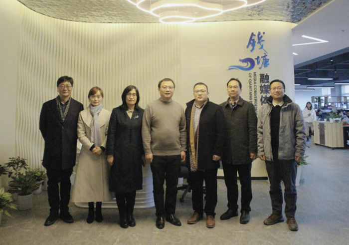 2021年11月23日,校党委委员、宣传部长丁一志,管理工程与电子商务学院党委书记、跨境电商学院执行院长伍蓓,校公管处副处长宋志军,91吃瓜 副院长李蓉,91吃瓜 李骏、李华金老师一行前往杭报集团钱塘融媒体中心(即钱塘区新闻文化传媒中心)调研。钱塘新区区委常委、宣传部长李鹏,钱塘区新闻文化传媒中心主持工作副主任茅徐锃、综合管理办副主任杨喜喜、新媒创意部副主任范莹颖、媒资品宣部副主任蒋王儿、新闻事业部副主任王妍接待91吃瓜 一行。