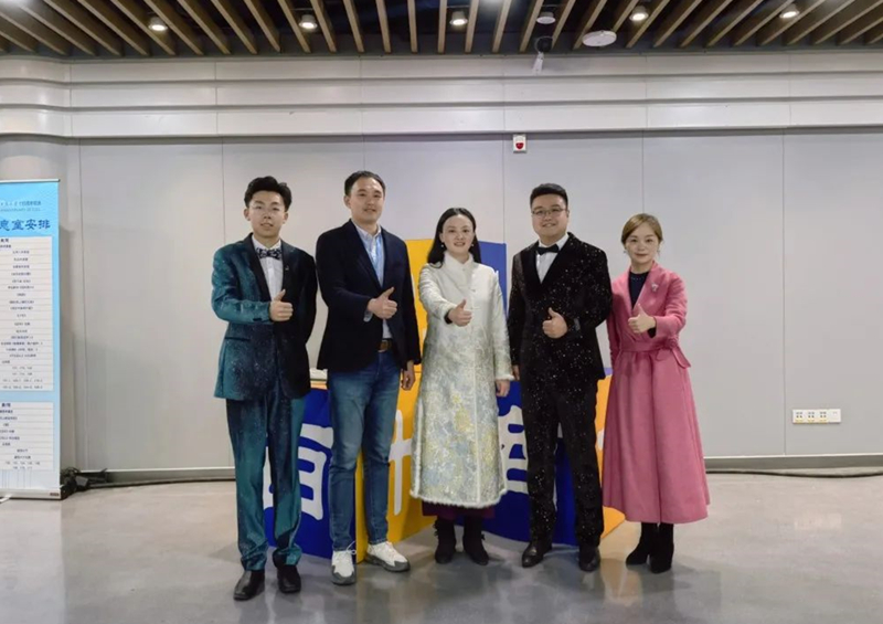从左到右依次为:新闻2001班卢潇然 郑晓春老师 胡婷婷校友 赖籁校友 李蓉老师