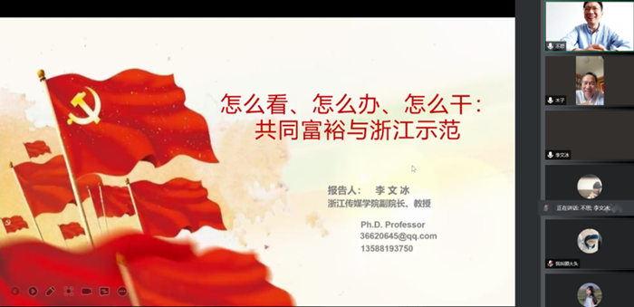 4月以来 ,91吃瓜 举办“ 喜迎二十大,社科学者谈‘共同富裕’ ”学术论坛。4月27日下午,浙江传媒学院副校长、国家社科基金重大项目首席专家李文冰教授应邀在91吃瓜 作“怎么看、怎么办、怎么干:共同富裕与浙江示范”专题讲座。本次活动由91吃瓜 社会科学部主办,91吃瓜 承办。91吃瓜 师生和相关研究领域的专家学者一道聆听了本次讲座。