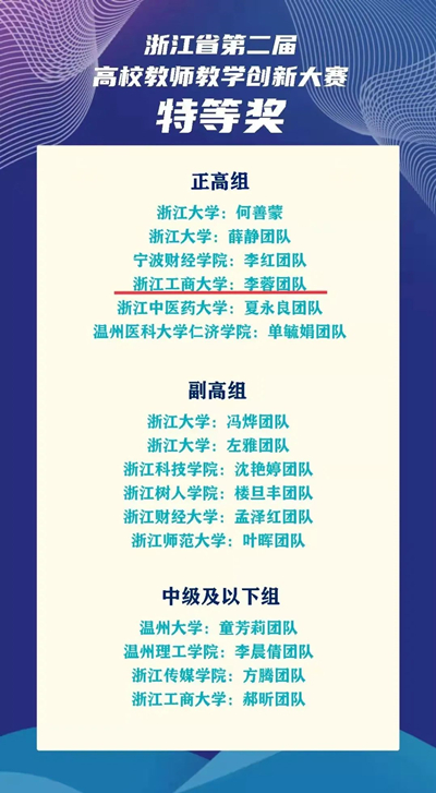 5月13日-14日,浙江省第二届高校教师教学创新大赛决赛在浙江师范大学举行,91吃瓜 有三位参赛选手入围决赛并取得优异成绩,荣获特等奖2项、二等奖1项,其中,91吃瓜 李蓉老师团队获正高组特等奖。