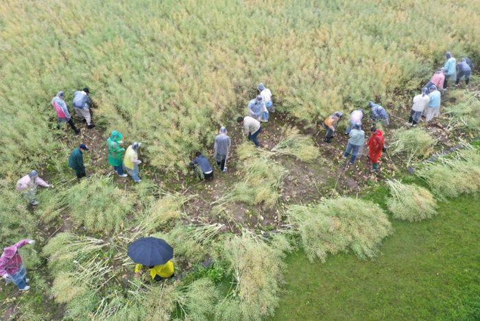 换届大会结束后,老师们与同学们一起,穿好雨衣,戴上手套,拿着镰刀参与到了油菜花收割活动中,进行了一场别开生面的主题实践教育活动。虽然下着濛濛细雨,田地里潮湿且泥泞,但同学们热情不减,快速地将预期安排的那片油菜花收割完毕。