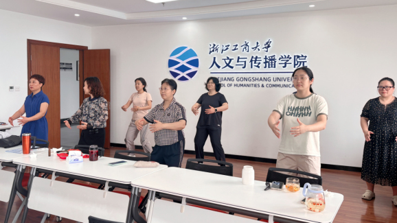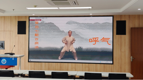 全体人员跟随视频舒展肢体,练习传统养生功法“八段锦”。“两手托天理三焦,左右开弓似射雕……”一招一式间,通过柔和舒展的动作放松肩颈、活络筋骨,紧张的身心逐渐放松。不少老师表示:“短短15分钟已感到气血通畅,以后要坚持练习。”